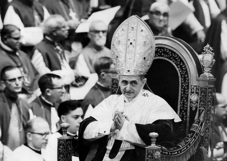Pope Paul VI makes his way past bishops during a session of the Second Vatican Council in 1964. (CNS file photo)