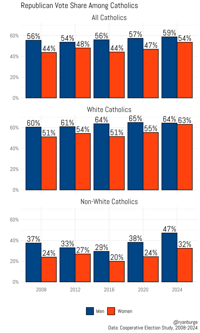 Burge’s analysis shows that the female Catholic vote became noticeably more Republican in 2024, increasing seven percentage points since 2020 and 10 points since 2016. Support for Donald Trump grew more among Catholic women than among Catholic men, although more men than women still voted Republican.