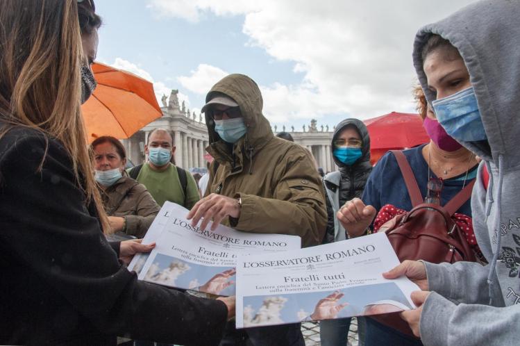 Free copies of the Vatican newspaper L’Osservatore Romano with the front page about Pope Francis’ encyclical, “Fratelli Tutti, on Fraternity and Social Friendship,” are distributed by volunteers to the faithful at the end of the Angelus in St. Peter’s Square at the Vatican Oct. 4, 2020 (CNS photo/ IPA/Sipa USA, Reuters).
