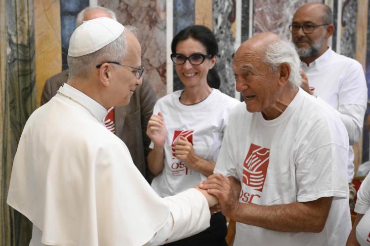 Pope Leo XIV greets a man involved in the Milan-based charity, Opera San Francesco for the Poor, during an audience at the Vatican Sept. 1, 2025 (CNS photo/Vatican Media)