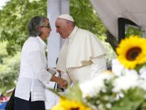 Pope Francis greets Hermana Blanca Nubia Lopez as he blesses the cornerstone of Talitha Qum homeless shelter in Cartagena, Colombia (CNS photo)