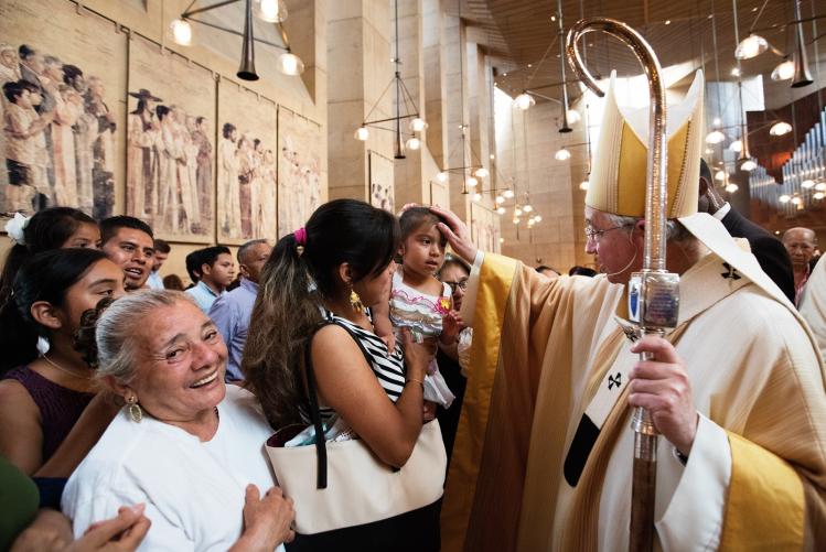 Jose H. Gomez of Los Angeles blesses a girl during a special Mass