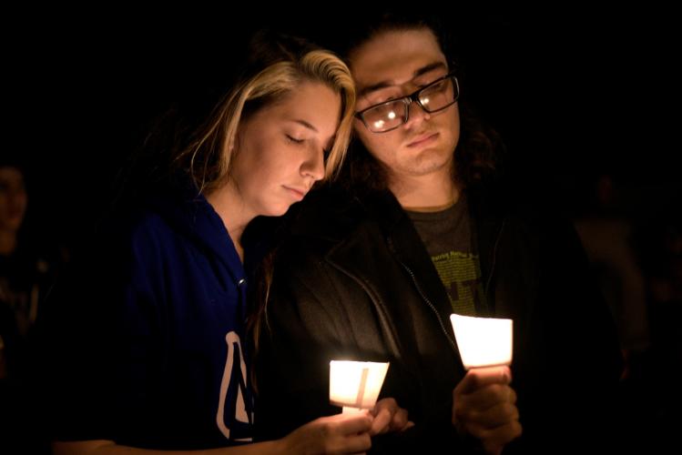 man and woman attend a candlelight vigil after a mass shooting Nov. 5