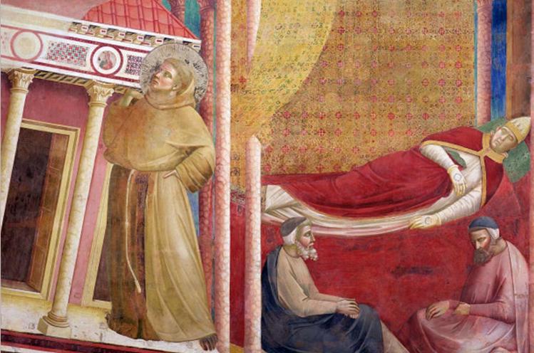 St. Francis holds up a church from falling onto the pope. Giotto di Bondone, Dream of Innocent III (Wikimedia Commons)