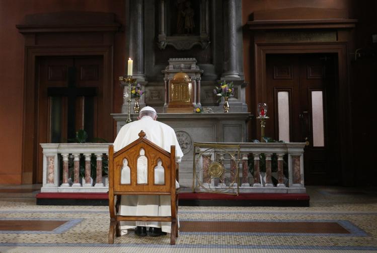 Francis prays in front of a candle in memory of victims of sexual abuse